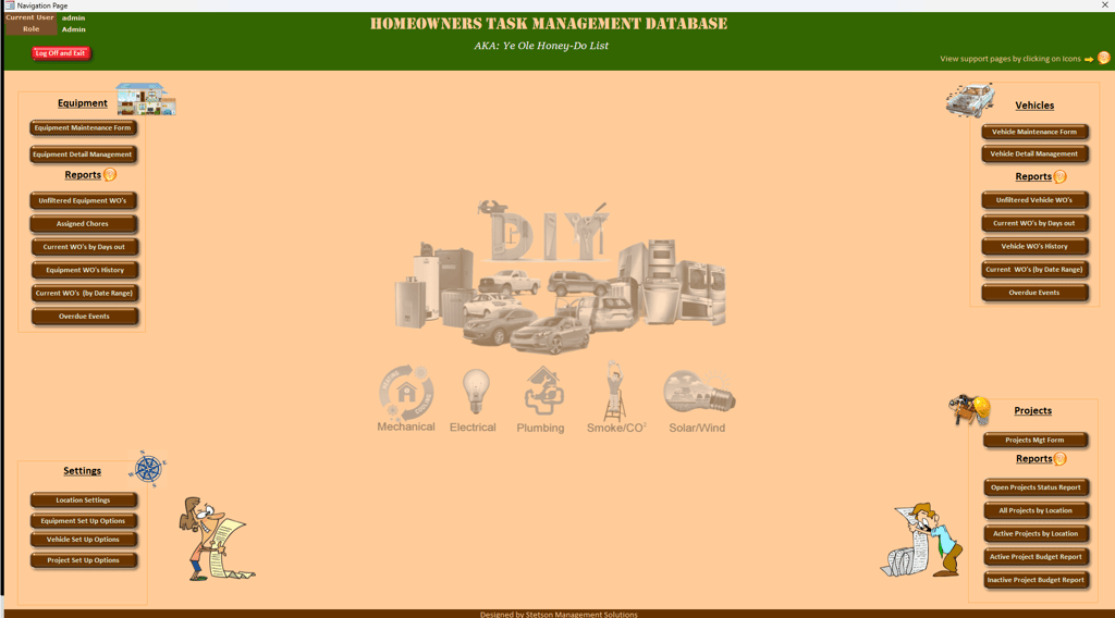 The purpose of the Homeowners Task Management Database is to provide the serious homeowner a comprehensive database to manage important tasks on a predetermined basis. The intent is to eliminate the most misaligned and dreaded HONEY-DO LISTS. Seriously though, I designed this with extensive consultation with my darling wife, Julie, who has for years (many) had that old list always available and out for me to see and to get done. While I knew what had to be done, I needed reminders as to when to do them. After all I was a Facility Manager and much like the old saying “A plumber’s house always leaks”, I never seemed to find the time to manage my own assets. I truly hope you find this database relatively simple, intuitive, and rewarding in making your assets last longer, run more efficiently and keep them as valuable as possible. Nothing beats having records for resale purposes to convince a potential buyer that there is a consistent history of diligent care.